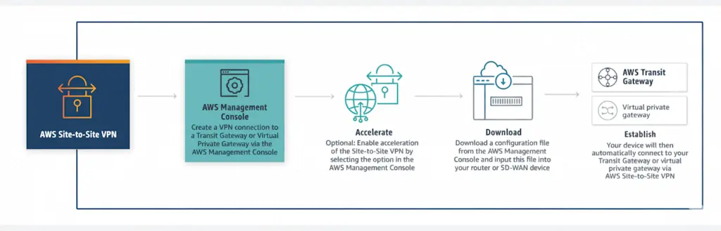 AWS Site-to-Site VPN is a fully managed service that uses IP Security (IPSec) tunnels to create a secure link between your data center or branch office and AWS resources. You can connect to both Amazon Virtual Private Clouds (VPCs) and the AWS Transit Gateway. Each connection includes two tunnels, which increase redundancy and reliability.