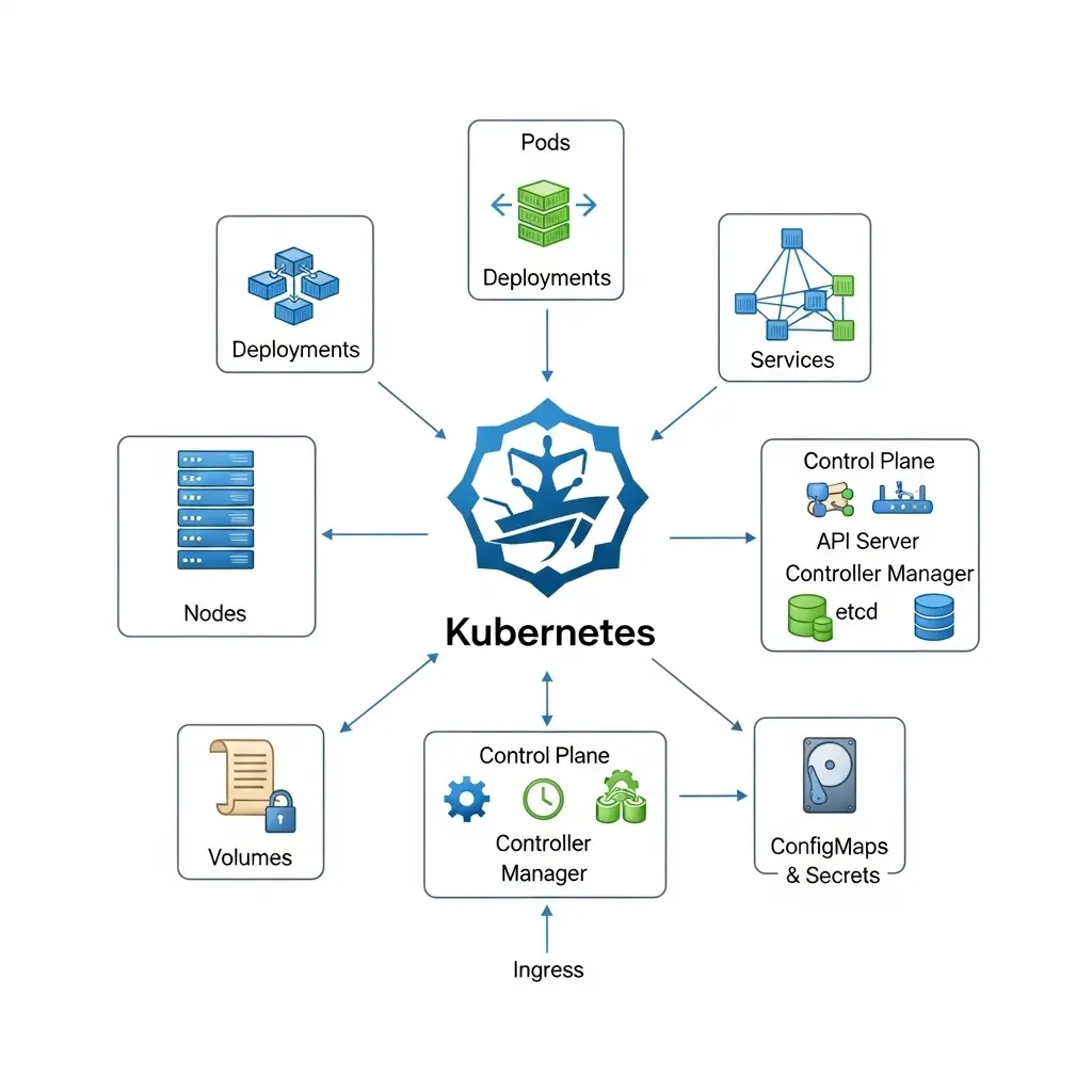- Master Node (Control Plane): Acts like the brain, making decisions about scheduling, scaling, and maintaining the desired state of the system. Components include API Server, Controller Manager, Scheduler, and etcd (cluster database).