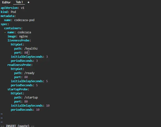Firstly create a pod-probes.yaml file and define the configuration with including liveness, readines and startup probes in the YAML configuration of the Pod.