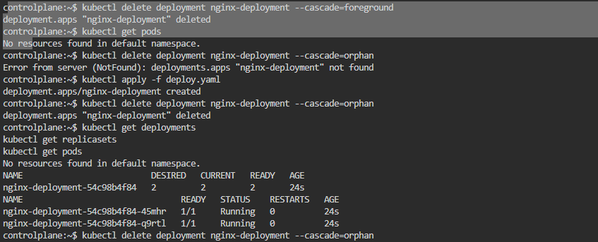 - Foreground Deletion: Kubernetes deletes all dependent objects before removing the parent, ensuring complete cleanup.