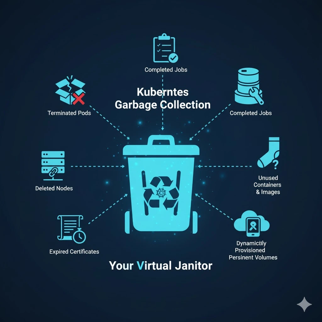 Garbage collection is a term that covers all the ways Kubernetes cleans up unused or unnecessary resources in a cluster. Think of it as your virtual janitor, sweeping away the remnants of past tasks to make room for new ones. Here are some of the things garbage collection helps with: