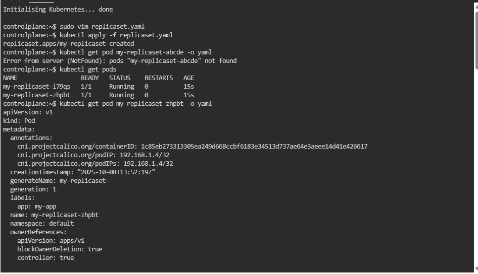 After creating the ReplicaSet, Kubernetes automatically creates Pods. You can inspect the owner references of one Pod: