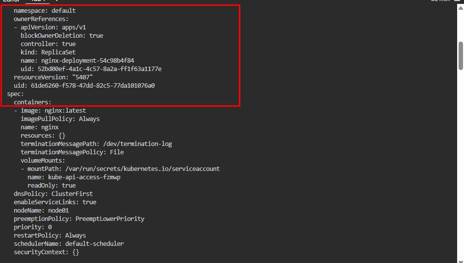 apiVersion: The API version of the owner object.kind: The type of the owner object (e.g.,Deployment,ReplicaSet).name: The name of the owner object.uid: A unique identifier for the owner object.controller: A boolean that indicates whether this owner object is a managing controller of the dependent.blockOwnerDeletion: Optional field that prevents deletion of the owner until the dependent is deleted.