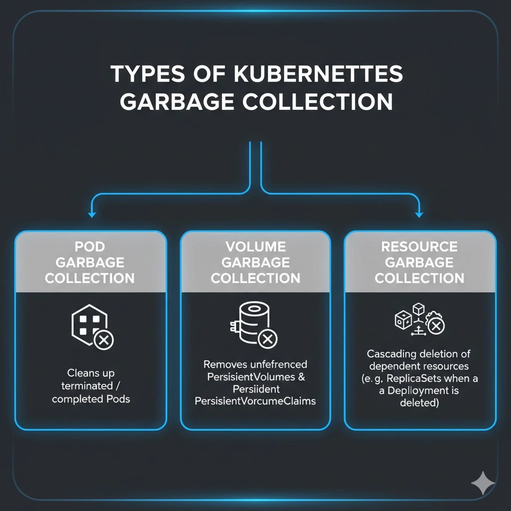 Kubernetes garbage collection (GC) actively manages and cleans up unused or orphaned resources in a cluster. It ensures that Pods, Volumes, Jobs, ReplicaSets, and other objects do not consume unnecessary resources, maintaining cluster efficiency and stability.