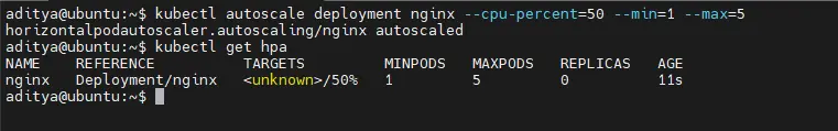 kubectl autoscale deployment nginx --cpu-percent=50 --min=1 --max=5