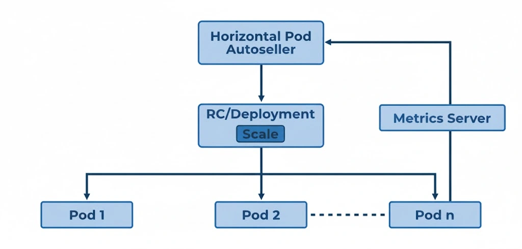Finally, the HPA operates within a continuous feedback loop. As application traffic and resource demands fluctuate, it repeatedly gathers metrics, evaluates thresholds, and adjusts the Pod count in real time. Consequently, the system remains responsive and maintains consistent application performance under varying workloads.