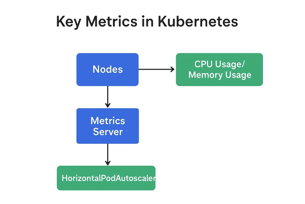 Kubernetes relies on the Metrics Server to gather resource usage metrics. It collects data from each node’s Kubelet and exposes it through the Kubernetes API. These metrics are crucial for Horizontal Pod Autoscaling (HPA), which adjusts the number of Pod replicas automatically based on real-time CPU or memory consumption.