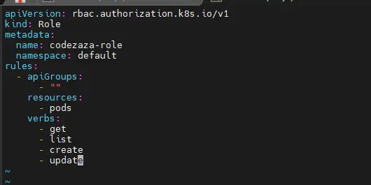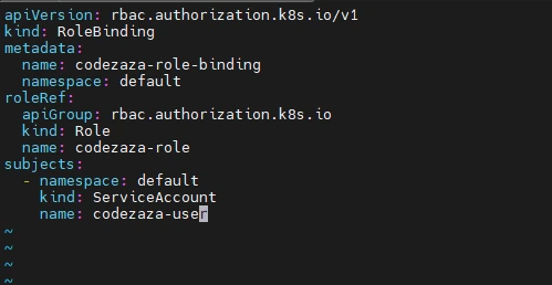 The manifest states that the codezaza-role Role (within the default namespace) should be assigned to the Service Account called codezaza-user. (If you were assigning the Role to a human User, you would set kind: User instead of kind: ServiceAccount.)
