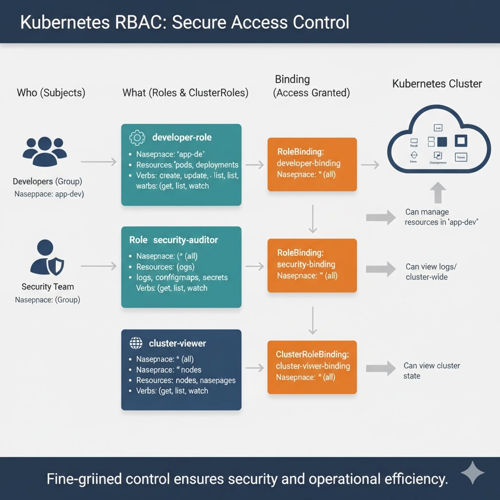 Role-Based Access Control (RBAC) is a fundamental security mechanism in Kubernetes that ensures users and applications can only perform the actions they are explicitly allowed to. By assigning precise roles, binding them to users or service accounts, and enforcing namespace or cluster-level restrictions, RBAC helps organizations maintain operational safety and prevent accidental or malicious changes.