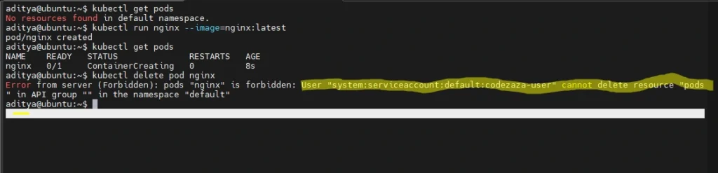 Error from server (Forbidden): pods "nginx" is forbidden: User "system:serviceaccount:default:codezaza-user" cannot delete resource "pods" in API group "" in the namespace "default"You’ve successfully used RBAC to enforce per-user access control constraints in your Kubernetes cluster.