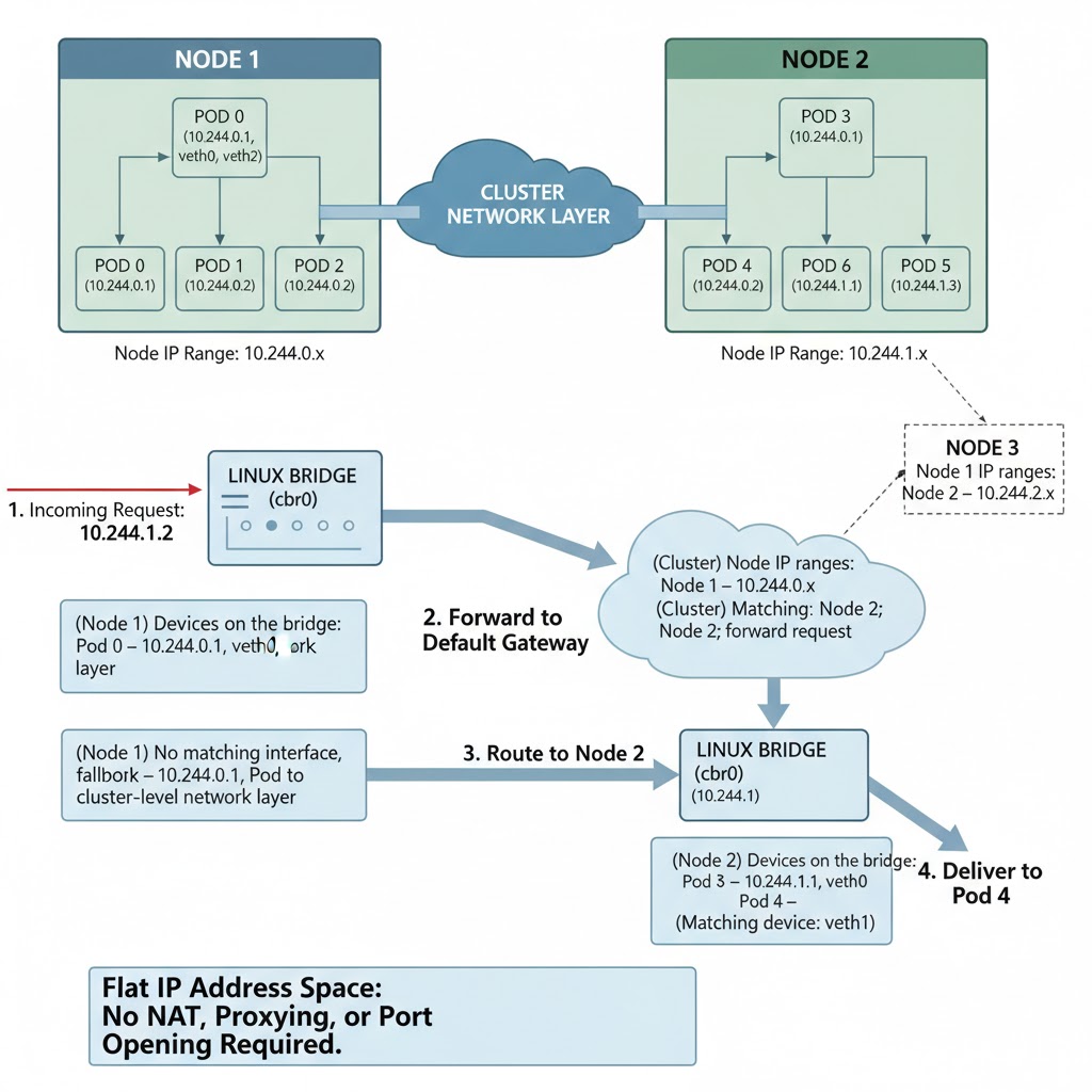 Each Node connects all the Pods running on it and passes their traffic to other Nodes when needed. This setup allows all Pods in the cluster to communicate freely. - No need for NAT (Network Address Translation).