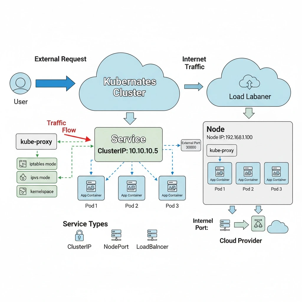 The kube-proxy component handles the routing using iptables, IPVS, or eBPF — ensuring load balancing and smooth communication.