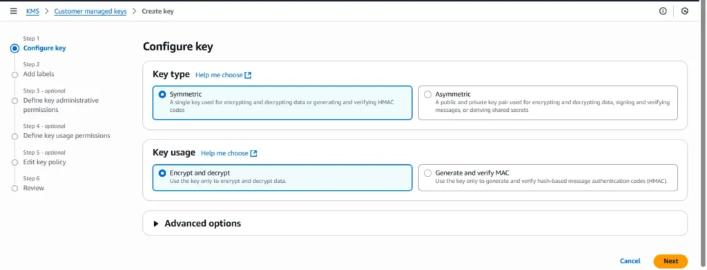 - Go to AWS Console → KMS → Customer managed keys → Create key