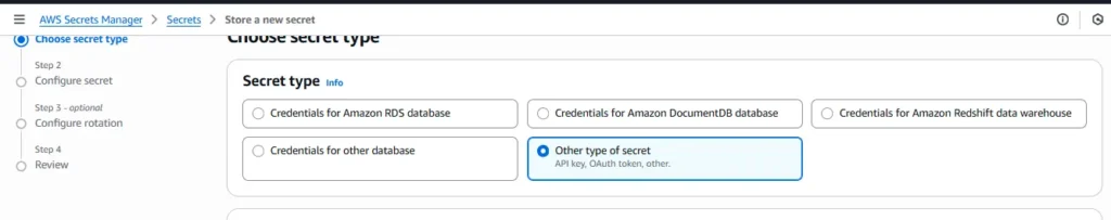 - AWS Console → Secrets Manager → Store a new secret