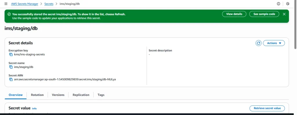 "Resource": "arn:aws:secretsmanager:ap-south-1:<your-account-id>:secret:ims-staging-db-secret-*"