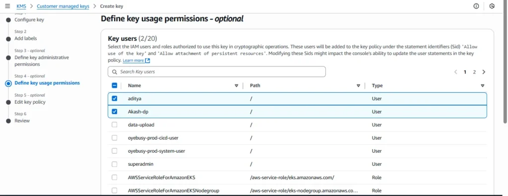 5.Key users: (you can skip for now; Secrets Manager will use it via service role, and your pod will only need kms:Decrypt through IRSA later).