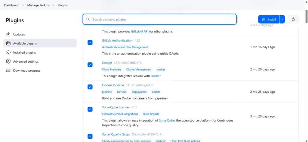 Step3 — Install Plugins like gitlab, docker, Sonarqube Scanner, and more in Jenkins.
