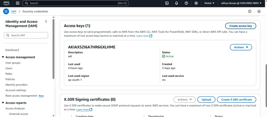 2. Scroll down until you get the option create Access keys