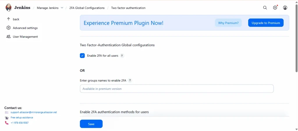 For Jenkins administrators, managing 2FA through the plugin interface is simple and scalable. You can enable or disable 2FA for all users in one click, apply it only to certain groups, or exclude system accounts. This centralized control reduces administrative overhead while maintaining robust protection