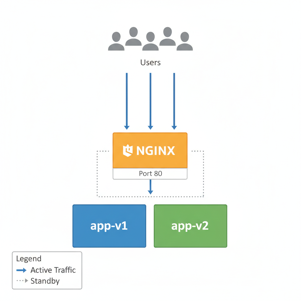 Nginx plays a crucial role as a reverse proxy that sits in front of both application containers. All user requests first reach Nginx, which then forwards traffic to the active backend container. Because Nginx supports configuration reloads without restarting, it allows traffic routing to be changed safely while keeping existing connections alive.