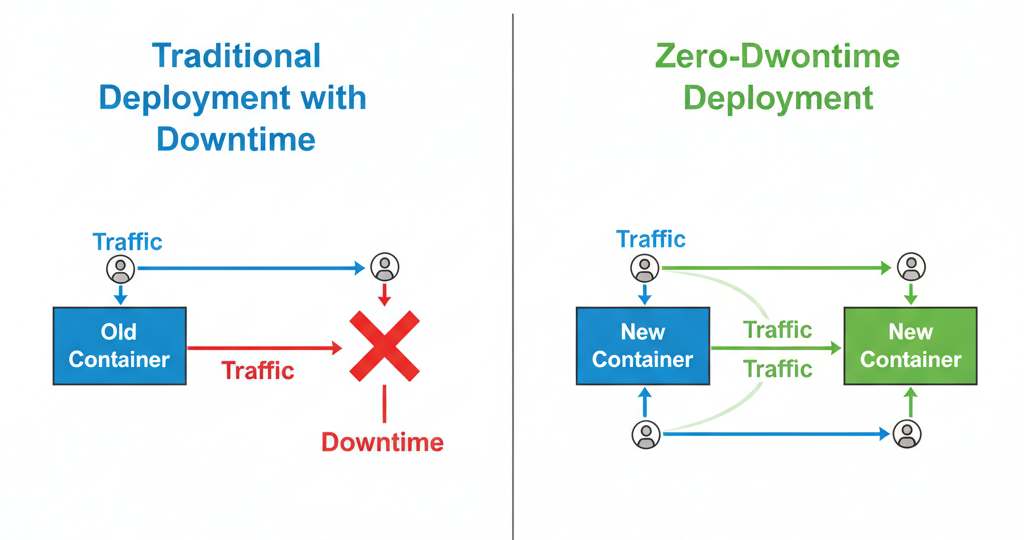 Imagine this: it’s Friday evening, and your team is deploying a critical update to your web application. Users are actively browsing your site when suddenly—everything goes dark. The old container stops, and for the next 30–60 seconds, users are greeted with error messages.