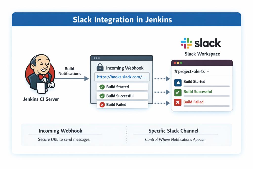 An Incoming Webhook allows Jenkins to send messages directly to a Slack channel using a secure URL. Each webhook connects to a specific Slack channel, which gives you full control over where notifications appear.