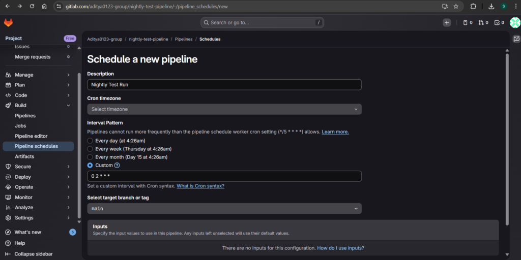 Once saved, GitLab automatically triggers the pipeline at the scheduled time.