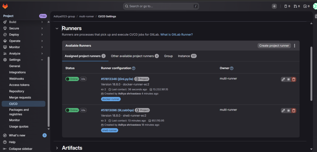 Implementing GitLab multi-runner architecture on AWS EC2 improves scalability, responsibility separation, and execution efficiency. By combining shell and docker executors, you create a flexible CI/CD environment suitable for real-world DevOps workflows.
