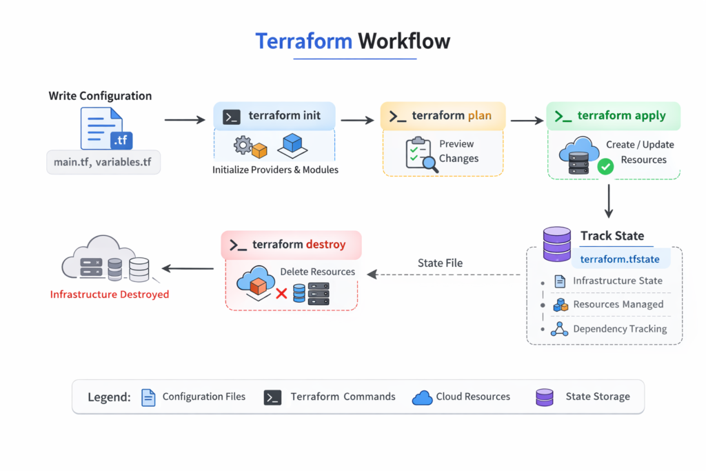 Terraform is a widely used Infrastructure as Code (IaC) tool that enables developers and operations teams to define, provision, and manage cloud infrastructure using human-readable configuration files. Understanding the Terraform workflow, which includes the init, plan, apply, and destroy commands, is essential for automating cloud resources safely and efficiently. By following this workflow, teams can reduce manual errors, maintain consistency, and manage infrastructure in a predictable and reliable way.