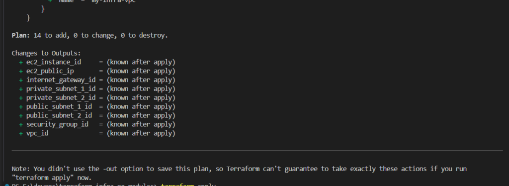 This shows you exactly what Terraform is going to create before actually creating anything. Always run this before apply.