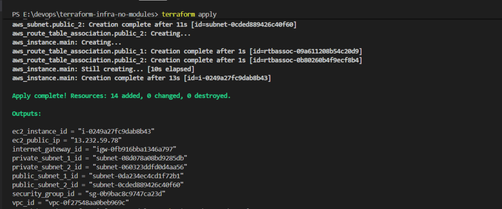 This approach is perfect for beginners because you can clearly see how each AWS resource is defined, how they reference each other, and how everything connects together to form a working network. Once you understand this, refactoring into modules becomes much easier.