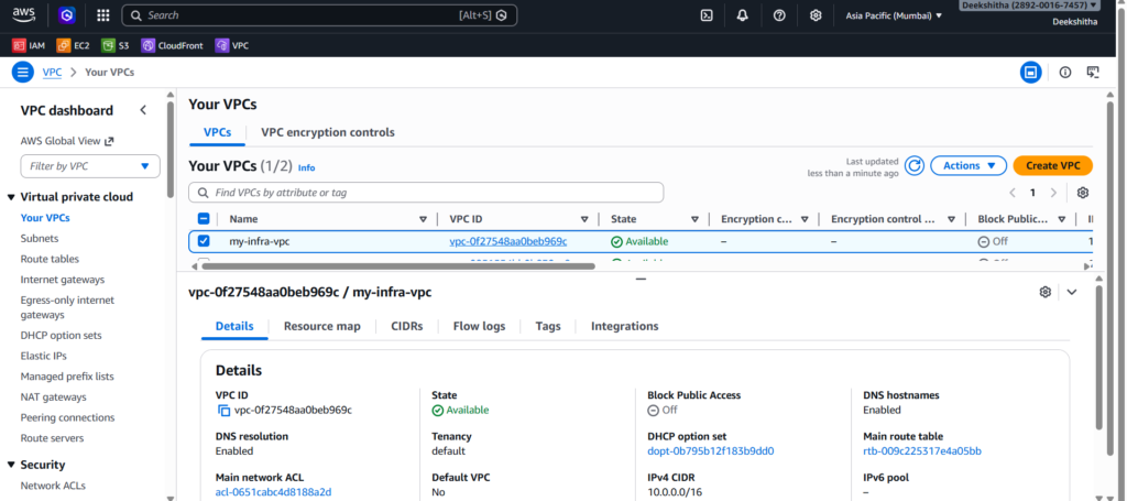 1. VPC Go to AWS Console → VPC → Your VPCs. You should see your newly created VPC with the CIDR block 10.0.0.0/16.