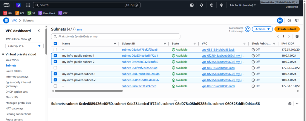 2. Subnets Go to VPC → Subnets. You should see all 4 subnets — 2 public and 2 private, each in a different availability zone.