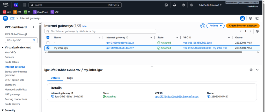 3. Internet Gateway Go to VPC → Internet Gateways. You should see your IGW with the state Attached to your VPC.