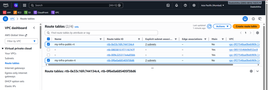 4. Route Tables Go to VPC → Route Tables. You should see two route tables — one public with a route to the Internet Gateway, and one private with no internet route.