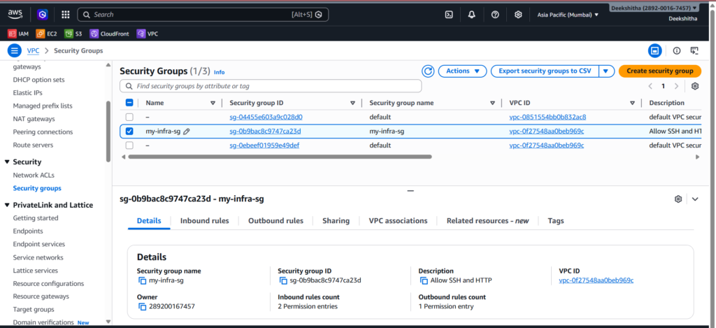 5. Security Group Go to EC2 → Security Groups. Click on your security group and check the inbound rules — you should see port 22 (SSH) and port 80 (HTTP) allowed.