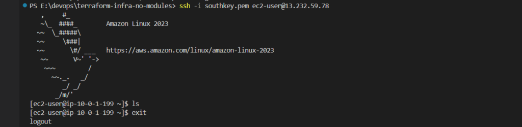 ssh -i your-key.pem ec2-user@<ec2_public_ip>If you get a bad permissions error on Windows, fix it by running: