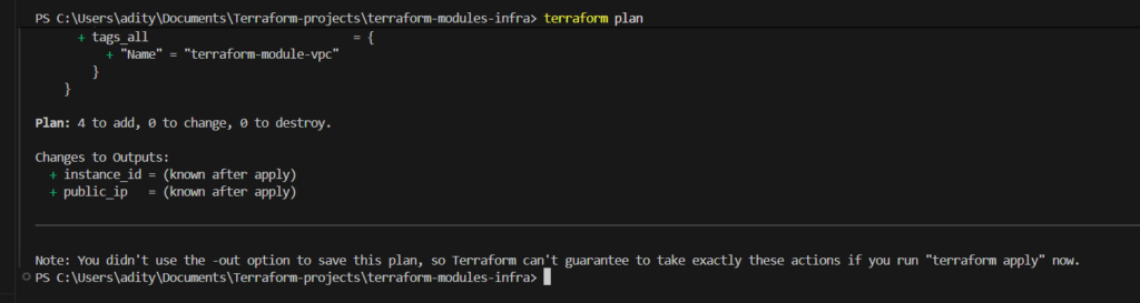 This implementation demonstrates how Terraform modules can organize AWS infrastructure while maintaining flexibility and maintainability. The project provisions networking resources, security configurations, and compute infrastructure through modular Terraform code. Furthermore, SSH access ensures that the instance can be managed immediately after deployment.