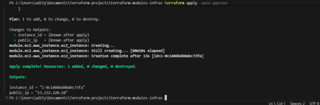 After the deployment finishes, Terraform outputs the EC2 instance’s public IP address.