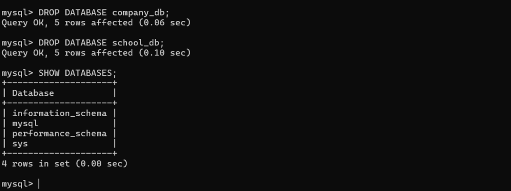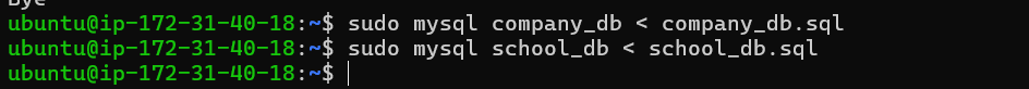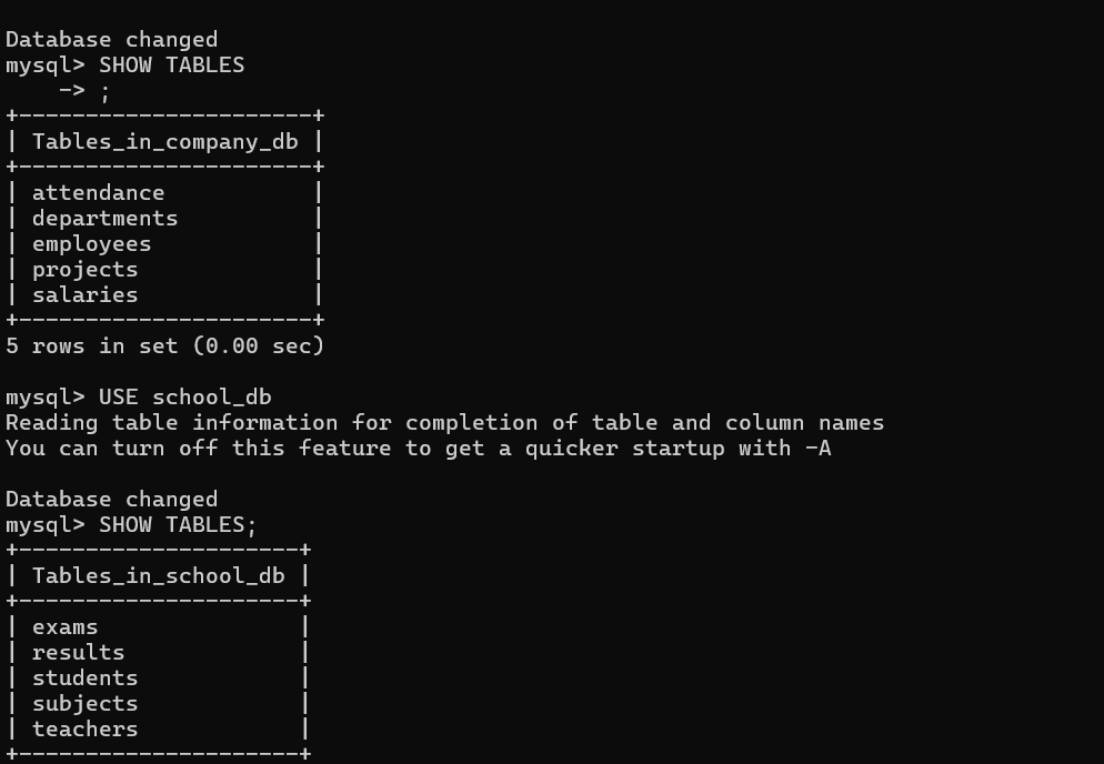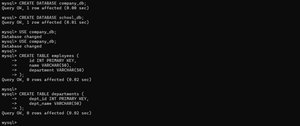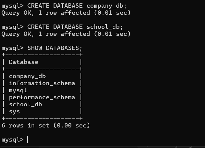 Next, we created two databases named company_db and school_db. These databases represent different domains, which helps simulate a real-world scenario.