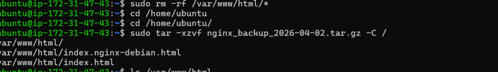 Using tar, we created a compressed archive of critical web files while Nginx continued handling live traffic — exactly how real-world DevOps and SRE teams operate. As next steps, consider automating backups with a cron job, shipping archives to Amazon S3 for offsite durability, or extending this pattern to cover stateful services like databases using mysqldump or pg_dump.