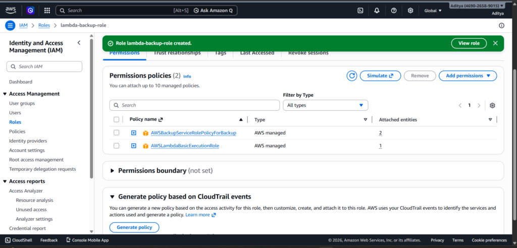 If this role is missing or misconfigured, backup jobs may fail silently or never appear in the console. Verifying this role early can save a lot of debugging time later.