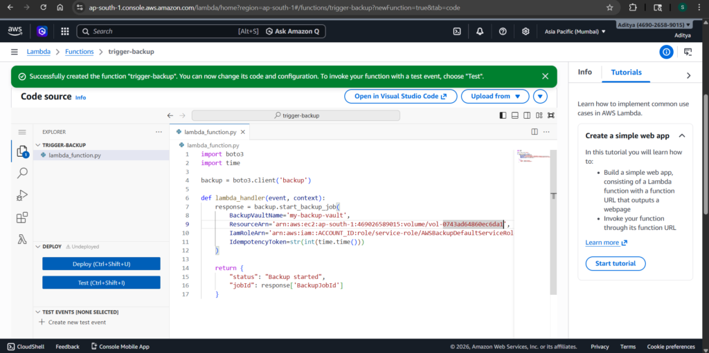 After deploying the Lambda function, you can trigger it using a test event. If everything is configured correctly, the function will return a response containing a backup job ID.